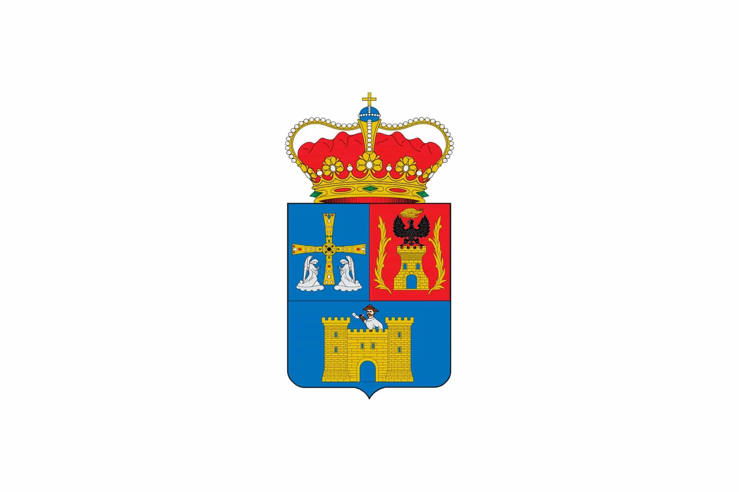Escudo del concejo de Pesoz. Su escudo es medio partido y cortado. En el cuarto superior izquierdo, sobre campo de azur, está representada la Cruz de los Ángeles, en referencia a su pasado eclesiástico. El cuarto superior derecho repre ...